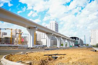 Транспортная развязка на пересечении ул. Бейсековой и пр. Тлендиева. В этом году планируется завершение монтажа пролетов путепровода и съездов.