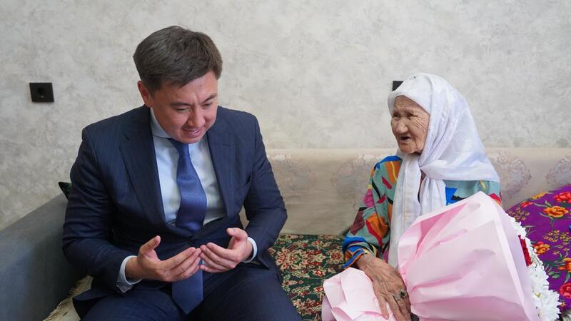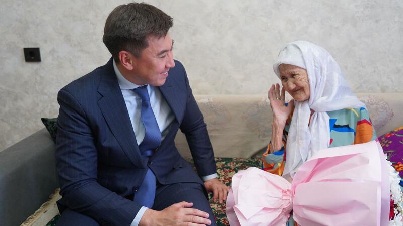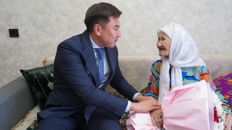 Аким города Кокшетау Әнуар Кумпекеев поздравил с 100-летним юбилеем уважаемую труженицу тыла, многодетную мать и ветерана труда Мариам Сыздыккызы.