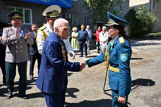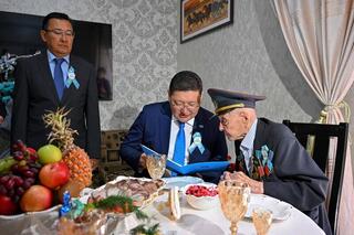 Аким области поздравил двух ветеранов с праздником и зачитал поздравления Президента. Вручил юбилейную медаль, сертификат на 5 миллионов тенге и специальный подарок от акимата области.