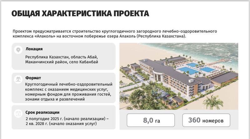 Инвесторы планируют построить круглогодичный туристический объект, рассчитанный на одновременный прием до 800 человек. Объем инвестиций составляет 20 миллион долларов. С вводом комплекса в эксплуатацию будет создано около 200 новых рабочих мест. Кроме того, проект позволит повысить туристическую привлекательность региона, увеличить налоговые поступления в местный бюджет и сформировать новый кластер на стыке медицины и отдыха.