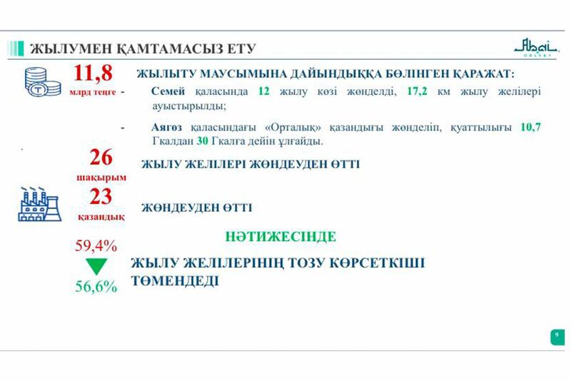 В текущем году для бесперебойного теплоснабжения Семея модернизированы 12 источников тепла и заменено 13,6 км тепловых сетей. В рамках поручения Главы государства по обеспечению населения 100% качественной питьевой водой в области реализуется 33 проекта, в том числе в районах Нахаловка, Бобровка и поселке Березовский города Семей.