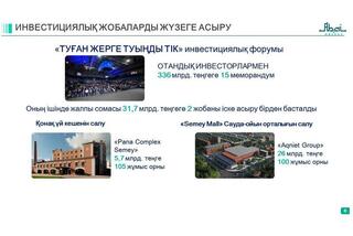 В рамках инвестиционного форума «Туған жерге туыңды тік» с участием предпринимателей и меценатов, выходцев из региона, были подписаны 15 соглашений на общую сумму 336 млрд тенге. По двум проектам общей стоимостью 31,7 млрд тенге уже началась реализация. В частности, гостиничный комплекс «Pana Complex Semey» стоимостью 5,7 млрд тенге будет введен в эксплуатацию и создаст 105 новых рабочих мест. Также компания «Aqniet Group» ведет строительство торгово-развлекательного центра «Semey Mall» стоимостью 26 млрд тенге, после ввода которого будет создано 100 рабочих мест.В индустриальной зоне «Өндіріс» площадью 96 га полностью освоены земельные участки под три новых проекта. Территория индустриальной зоны будет расширена до 186 га, ведется работа по созданию малого промышленного парка. В перспективе для промышленной зоны Семея планируется выделение 500 га земли. В городе также запланирована реализация шести инвестиционных проектов на сумму 23,8 млрд тенге.