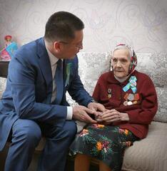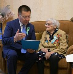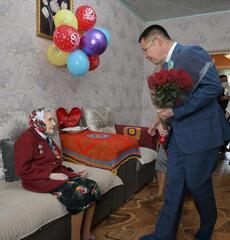 В Павлодаре глава региона посетил и поздравил ветеранов Сергея Выжутовича, Марию Курбатову, Василия Григораш и Николая Ступку, а также ветеранов, проживающих в области: Марию Матюшину - в с. Сычевка Павлодарского района, Василия Московченко - в п. Калкаман с.з.г. Аксу, Анну Носову - в с. Иртышск Иртышского района и Қайыра Хасенова - в с. Баянаул Баянаульского района.