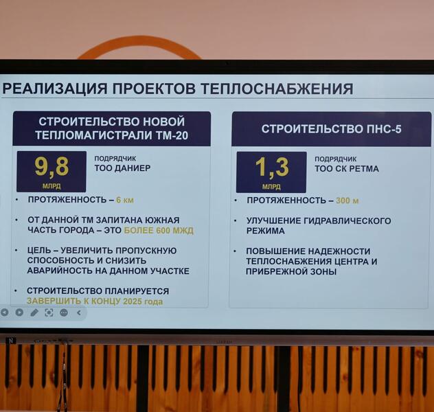 Далее аким посетил участок капитального ремонта теплотрассы на пересечении ул. Малайсары батыра и ул. Муткенова. На участке длиной 365 метров уже смонтировано более половины трубопровода диаметром 426 мм. Завершить монтаж трубопровода для подачи для подачи горячего водоснабжения отключенным на время работ потребителям (13 абонентов) планируется до конца августа, полностью же завершить работы – до 10 сентября 2025 года.