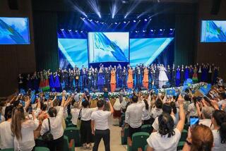 Мероприятие началось с церемонии выноса Государственного флага и Конституции на сцену, после чего был исполнен Государственный гимн.