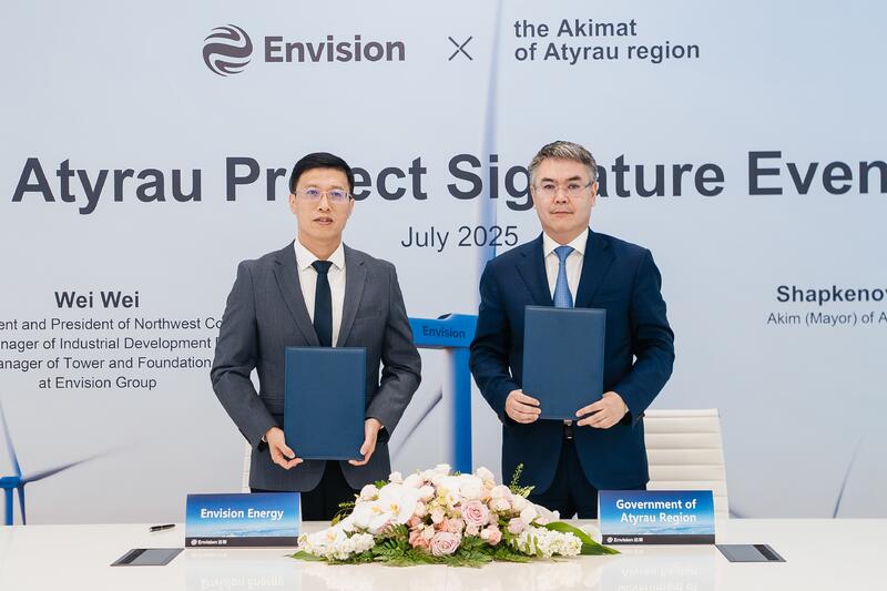 * Строительство ветровой электростанции.Китайская компания Envision Energy намерена построить в Атырау ветровую электростанцию мощностью 500 МВт. Соответствующий меморандум подписали аким области Серик Шапкенов и глава компании Вэй Вэй.