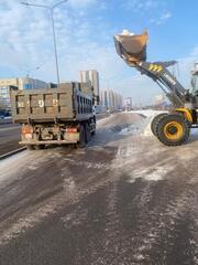 Для безопасного передвижения горожан дороги, тротуары и улицы посыпаются технической солью. Эти работы также ведутся круглосуточно.