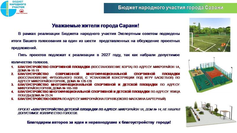 В рамках реализации Бюджета народного участия Экспертным советом подведены итоги Вашего голосования за один из шести представленных на обсуждение проектных предложений.