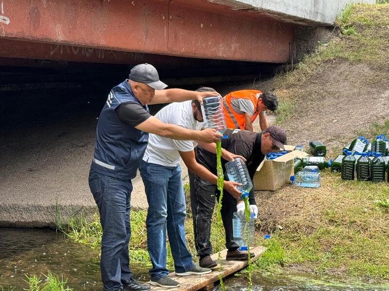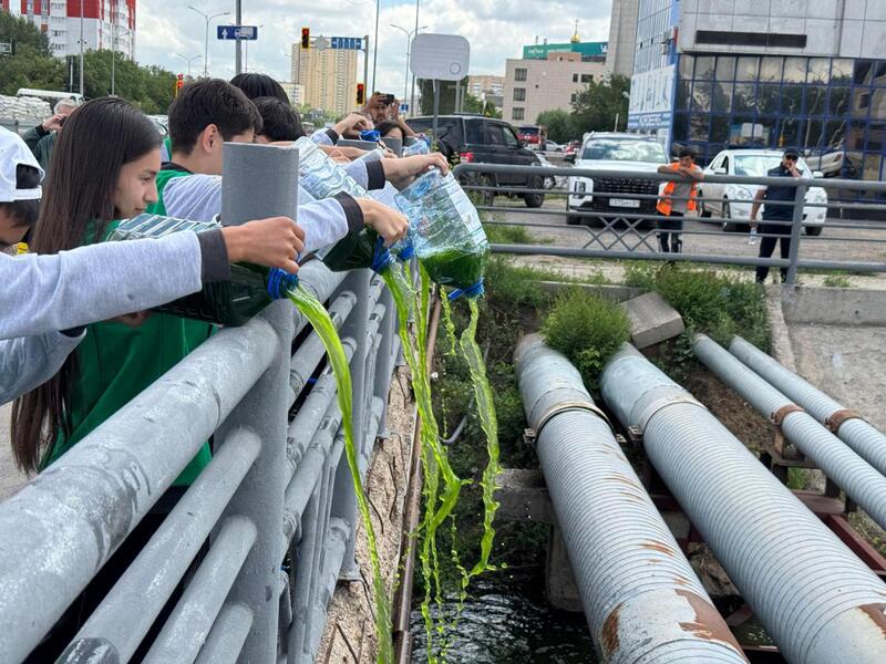 Волонтеры запустили в ручей Сарыбулак 600 литров суспензии очищающей зеленой микроводоросли хлореллы.