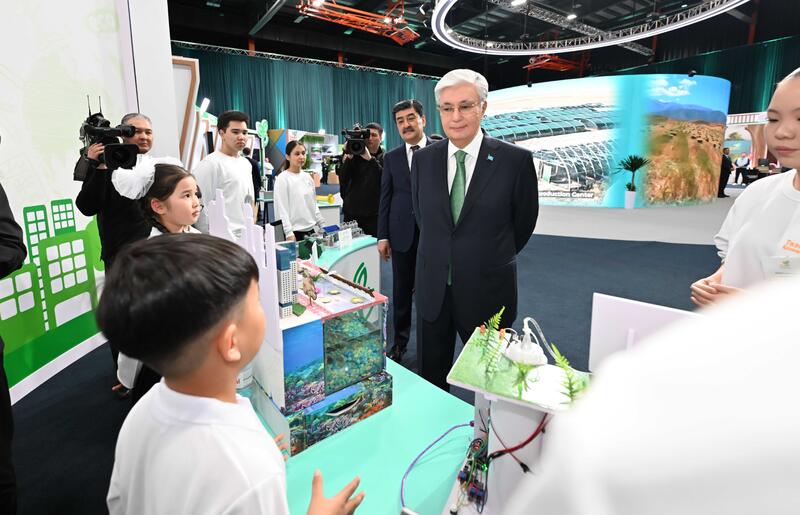 Касым-Жомарту Токаеву была представлена тематическая выставочная экспозиция, включающая секции по управлению отходами, проекты промышленных предприятий, стартапы в сфере экологии, школьные экологические инициативы, а также детские художественные работы на экологическую тематику.
