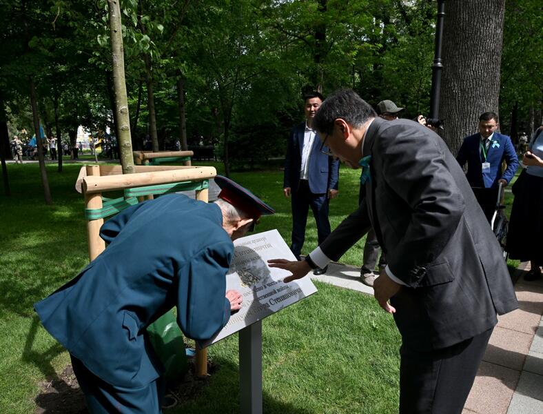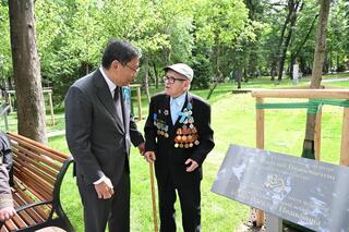 После церемонии возложения цветов Ерболат Досаев вместе с фронтовиками и их близкими посетил Аллею ветеранов Великой Отечественной войны, открытую накануне 9 мая.