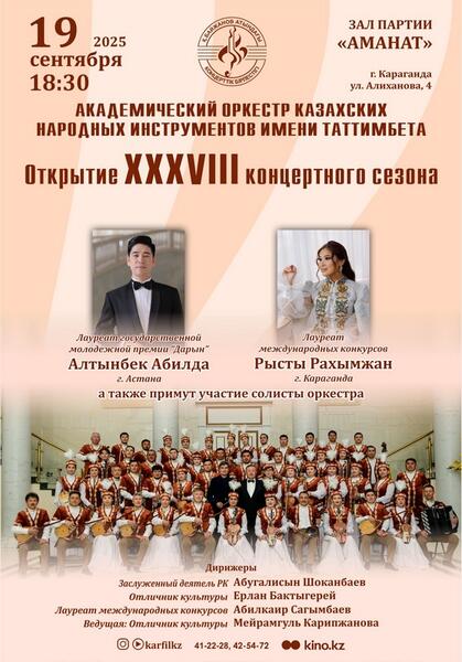 Карагандинцев и гостей города приглашают на открытие 38-го концертного сезона Академического оркестра казахских народных инструментов имени Таттимбета. Концерт состоится 19 сентября в 18:30 в зале партии «Аманат» по адресу: улица Алиханова, 4.