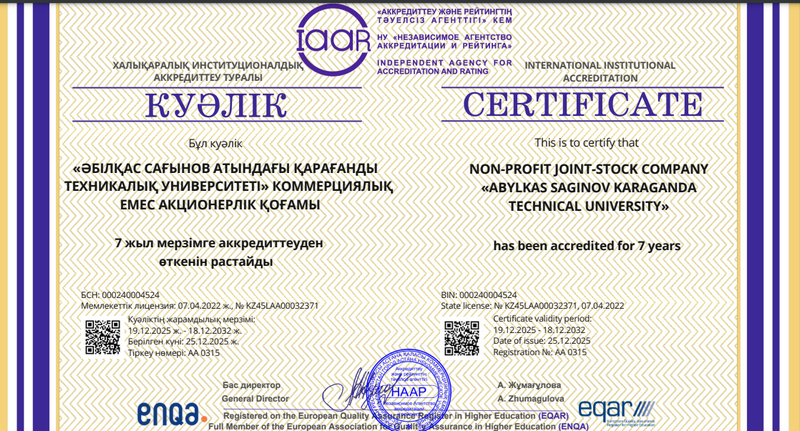 Карагандинский технический университет имени Абылкаса Сагинова успешно прошёл международную институциональную реаккредитацию Независимого агентства аккредитации и рейтинга (НААР). По итогам внешней экспертизы вуз получил аккредитацию сроком на семь лет – это максимальный период, предусмотренный процедурой.