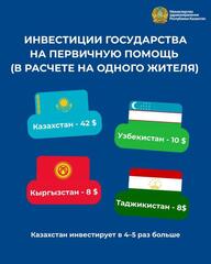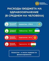 При этом, по данным Всемирного банка, по расходам на здравоохранение на душу населения лидирует Туркменистан с показателем 581 доллар США. Казахстан находится на второй позиции – 576 долларов. В Узбекистане расходы государства на человека составляют – 192 доллара, в Кыргызстане – 97, а в Таджикистане – 85.