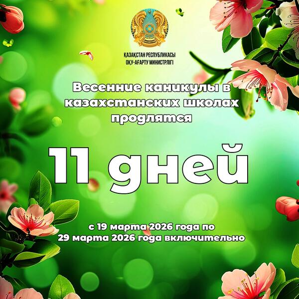 С 19 по 29 марта 2026 года казахстанские школьники будут находиться на весенних каникулах в течение 11 дней. В этот период для содержательного и полезного проведения свободного времени будет реализован специальный комплекс мероприятий, направленных на всестороннее развитие личности в рамках единой программы воспитания «Адал азамат».