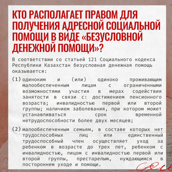 В соответствии со статьей 121 Социального кодекса Республики Казахстан безусловная денежная помощь оказывается: