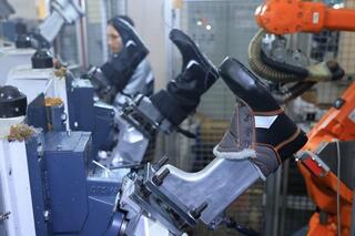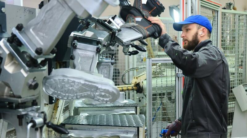 Особая гордость фабрики – литьевая машина немецкой фирмы Desma. На ней отливают двухслойную полимерную подошву. Роботизированный агрегат действует с особой точностью, подошва сцепляется с заготовкой верха обуви на молекулярном уровне.