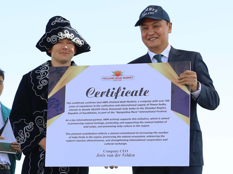 Главным событием фестиваля в этом году стало вручение Жамбылской области 40 тысяч луковиц тюльпанов от Королевства Нидерландов. Ценный подарок торжественно передал менеджер компании Holland Bulb Market Марсели Пьехна.