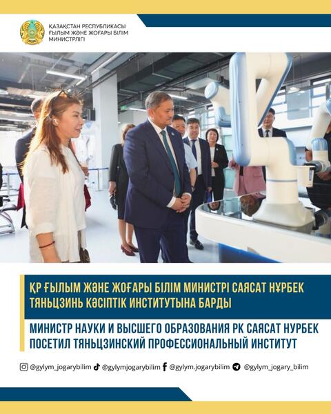 Министру была представлена материально-техническая база института, включая лаборатории и учебные центры. Секретарь партийного комитета КПК Тяньцзинского профессионального института Ся Цзинбо (Xia Jingbo) подробно рассказал о перспективных направлениях внедрения инновационных решений в образовательный процесс, в частности в области «умных» технологий, автопилотирования, робототехники и цифрового производства. Эти направления являются приоритетными для подготовки специалистов нового поколения, востребованных как в Китае, так и в Казахстане.