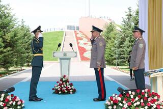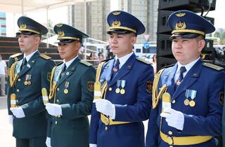 В День государственных символов Президент Казахстана – Верховный главнокомандующий Вооруженными силами Касым-Жомарт Токаев вручил офицерские погоны 14 лучшим выпускникам учебных заведений министерств обороны, внутренних дел, по чрезвычайным ситуациям и КНБ.