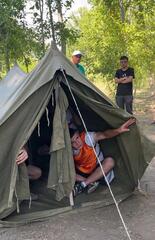 сборке палатки на время, завязывании туристических узлов,
