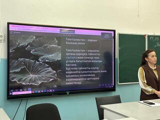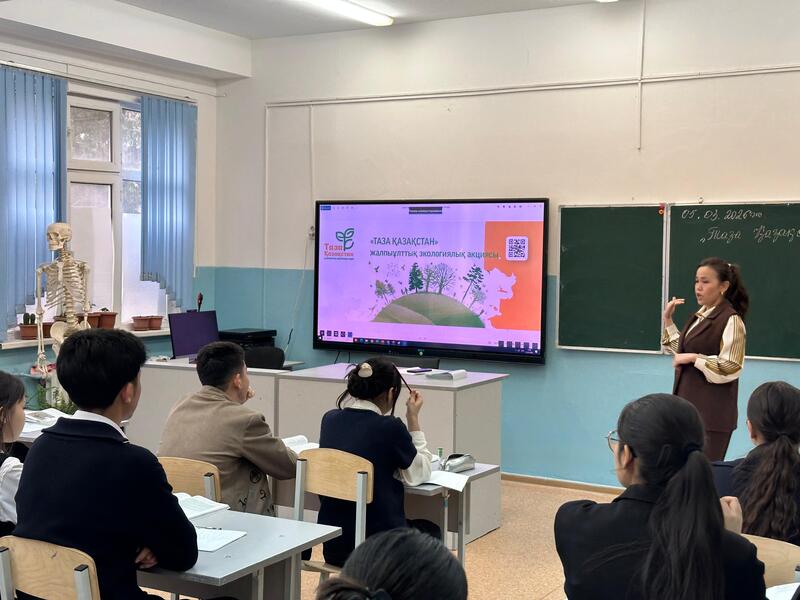 Учитель биологии Динара Орынтаева рассказала школьникам о важности защиты природы и организовала обсуждение вопросов поддержания чистоты города, правильной утилизации бытовых отходов и предотвращения загрязнения окружающей среды. В ходе занятия были показаны видеоматериалы о проводимых в Шымкенте работах по благоустройству, посадке деревьев и озеленению.