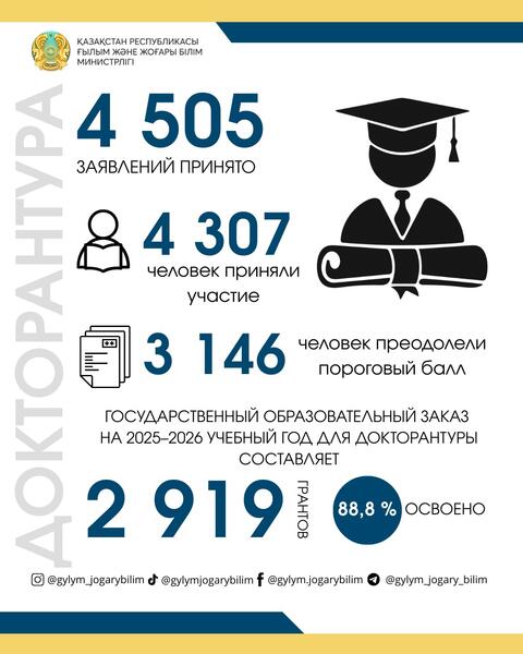 Существенно возрос и спрос на докторантуру. В этом году вступительные испытания прошли 4 307 человек, из которых 3 146 получили возможность продолжить свой путь в науке. На 2025-2026 учебный год на докторантуру выделено 2 919 государственных грантов, в том числе: педагогические науки – 486, инженерные и строительные специальности – 615, информационно-коммуникационные технологии – 161.