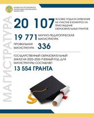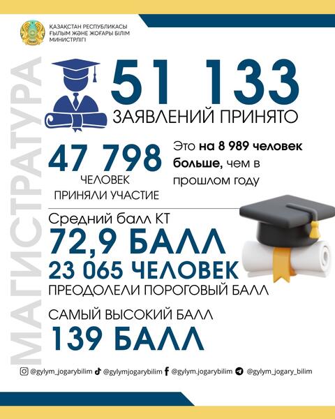 В этом году на комплексное тестирование по магистратуре поступило более 51 тысячи заявок, что на 9,5 тысячи больше по сравнению с прошлым годом. В тестировании приняли участие 47 798 абитуриентов, почти половина из которых, а именно 23 065 человек, преодолели пороговый балл, подтвердив тем самым свою настойчивость и готовность к обучению.