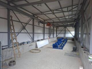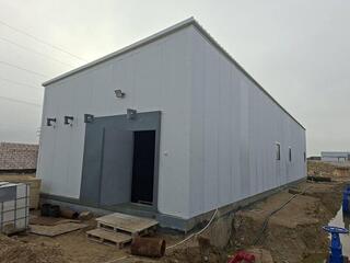 В настоящее время на строительной площадке ведутся монтажные работы. Работы по поднятию земельного участка полностью завершены, предусмотренные проектом насосные установки уже доставлены. На сегодняшний день строительная готовность объекта составляет 70%. Подрядная организация планирует ввести объект в эксплуатацию за счёт собственных средств в первом полугодии 2026 года.
