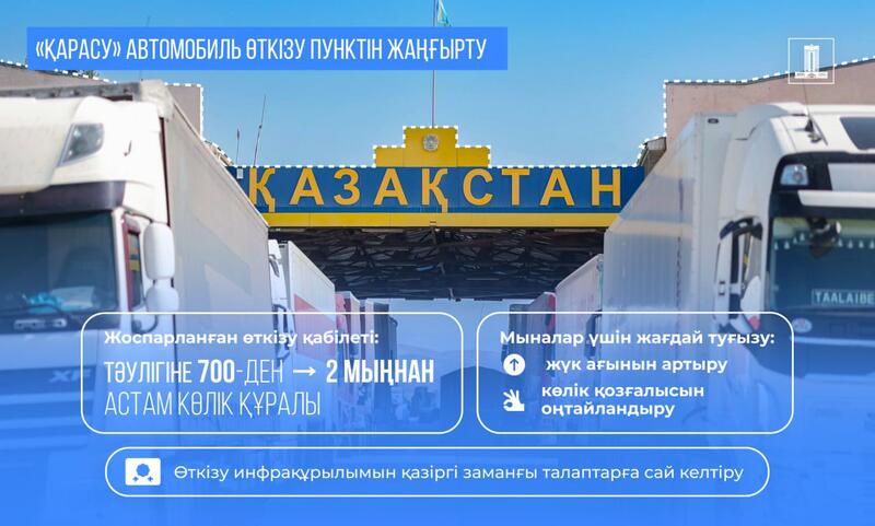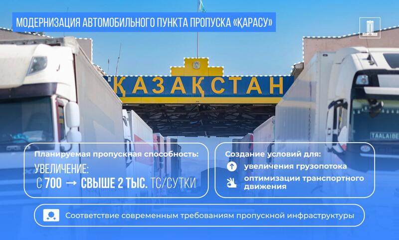По пункту «Қарасу» начата работа по модернизации, которая позволит увеличить пропускную способность с 700 до свыше 2 тыс. транспортных средств в сутки. Создаются условия для улучшения грузопотока и транспортного движения. Проект направлен на увеличение пограничной пропускной инфраструктуры в соответствии с современными требованиями.