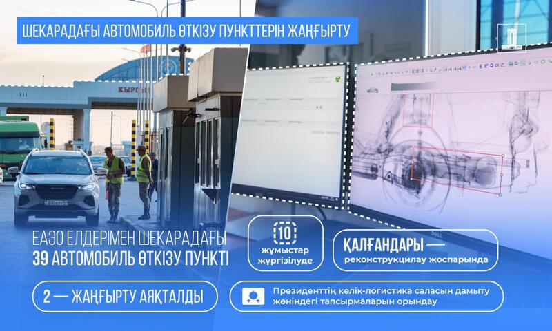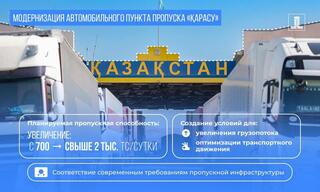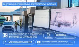 На границе со странами ЕАЭС расположены 39 автомобильных пунктов пропуска. На двух из них ремонтные работы полностью завершены. Модернизация начата на десяти пунктах, в том числе находящихся на казахстанско-российской границе. Реконструкцией будут охвачены и другие пункты пропуска.
