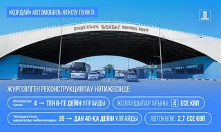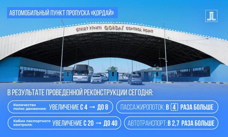 На АПП «Қордай» в результате ранее проведенной реконструкции увеличено количество полос движения с 4 до 8, число кабин паспортного контроля – с 20 до 40. Пропускная способность выросла в 4 раза по пассажиропотоку, в 2,7 раза по автотранспорту.