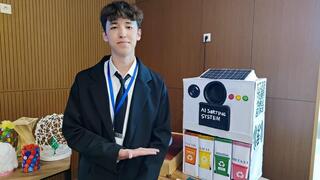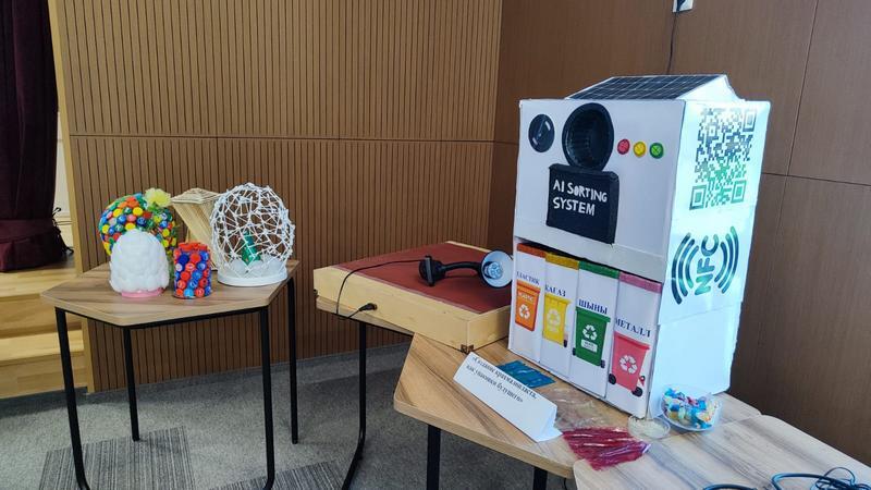 Ученик карагандинской гимназии №3 Имран Абсадыков представил проект «SmartEcoBin 2.0 — интеллектуальная станция автоматической сортировки отходов с элементами искусственного интеллекта». Устройство работает автономно: человеку необходимо показать мусор камере, после чего система с ИИ распознаёт его, строит логистический маршрут внутри короба и направляет в нужный отдел.