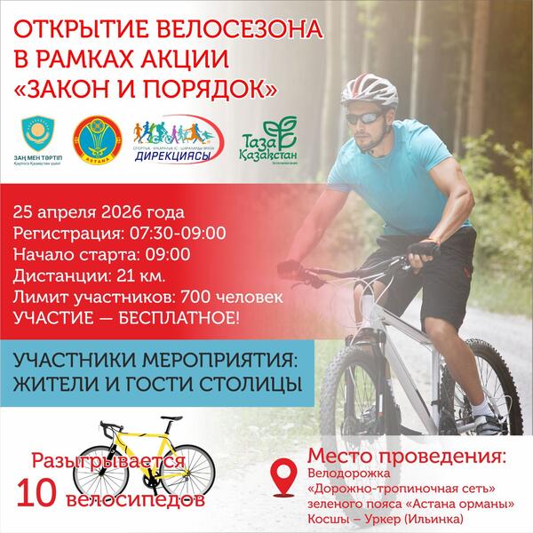 В Астане 25 апреля состоится официальное открытие летнего велосезона. Мероприятие проводится в рамках республиканской акции «Таза Қазақстан» и принципа «Закон и порядок», передает официальный сайт акимата столицы.