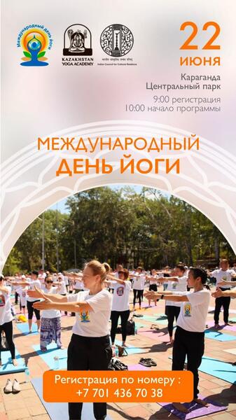 9:00 – праздник в честь Международного дня йоги с участием представителей посольства Индии в Казахстане, Казахстанской академии йоги. Все желающие смогут участвовать в йога-протоколе – это 30 асан, практики дыхания и релаксации. Будет розыгрыш футболок и других призов.