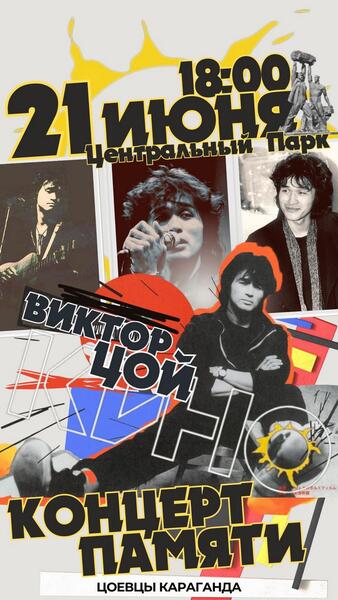 21 июня, 18:00 – на главной парковой сцене концерт памяти Виктора Цоя. Выступят карагандинские рок-группы «Грузовик», «Фрактал», «Ниагара» и «11-ый этаж». Они исполнят хиты группы «Кино».