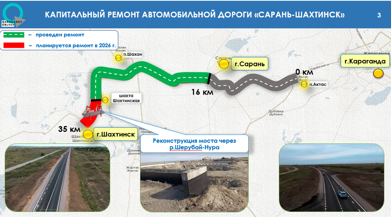 – Продолжается капитальный ремонт автодороги Сарань – Шахтинск и реконструкция участка Шахан – Жанаталап. Разработана проектно-сметная документация по ремонту дороги от села Дубовка до Сарани, – сообщил руководитель управления пассажирского транспорта и автомобильных дорог Максат Мукашев на аппаратном совещании. – Идёт реконструкция моста через реку Шерубай-Нуру. На мосту через реку Ишим технический проезд планируем открыть в марте, что позволит обеспечить безопасное движение в паводковый период без необходимости объезда.