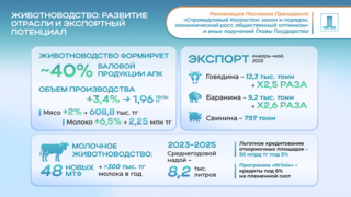 С августа 2025 года введена программа льготного кредитования откормочных площадок под 5% годовых объемом 50 млрд тенге, что позволит загрузить мощности более чем на 60% при обязательной реализации половины продукции на внутренний рынок.