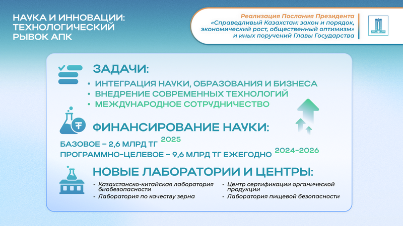 Финансовая поддержка научной сферы носит системный характер: объем базового финансирования НАНОЦ в 2025 году увеличен до 2,6 млрд тенге, а на программно-целевое финансирование в 2024–2026 годах ежегодно направляется по 9,6 млрд тенге. Это позволяет реализовывать долгосрочные научно-технические программы, охватывающие все ключевые направления агропромышленного комплекса – от животноводства и растениеводства до переработки, ветеринарии и органического земледелия.