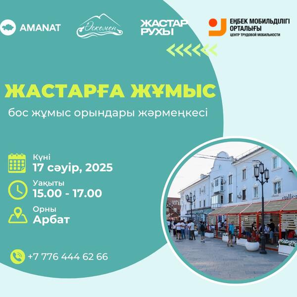 Приглашаем вас на ярмарку вакансий в рамках проекта «Жастарға жұмыс»Место проведения: г. Усть-Каменогорск, «Арбат»Дата: 17 апреля 2025 годаВремя: 15:00