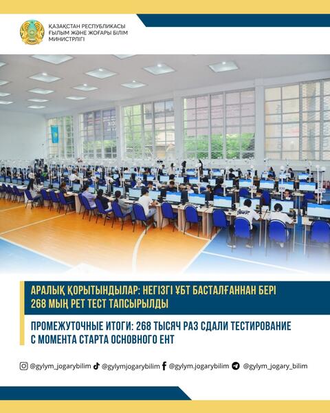 С момента старта основного ЕНТ-2025, 16 мая, тестирование прошли около 268 тыс. раз. 74% абитуриентов сдавали тестирование на казахском языке, 26% – на русском и 221 человек – на английском.
