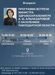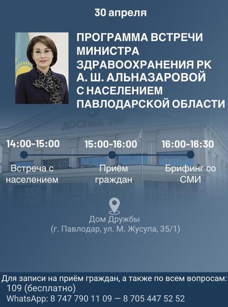 30 апреля 2026 года Павлодарскую область с рабочим визитом посетит Министр здравоохранения Республики Казахстан Акмарал Шарипбаевна Альназарова.