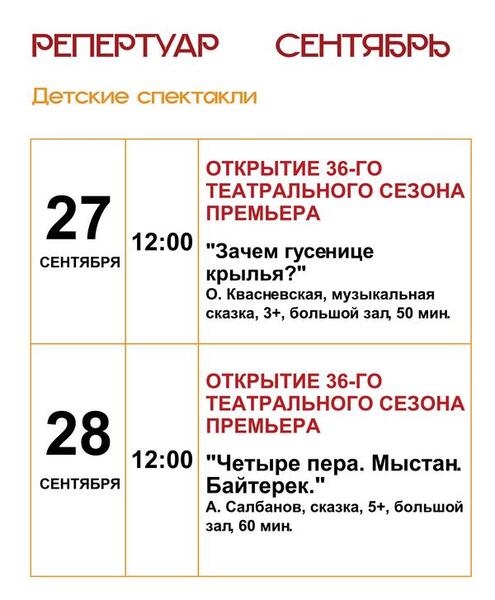 Впереди у театра новый, 36-й сезон. 27 сентября состоится премьера сказки для самых маленьких «Зачем гусенице крылья?» в постановке Оксаны Квасневской. Эта история расскажет о превращении гусеницы в бабочку, о дружбе и взаимопонимании.