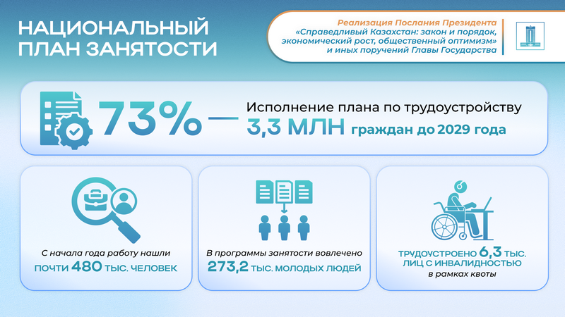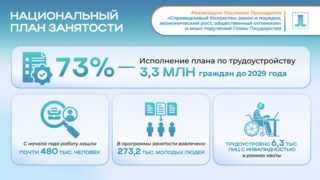Главой государства поручено до 2029 года трудоустроить 3,3 млн граждан, на сегодня этот план выполнен на 73%. С начала года работу нашли почти 480 тыс. человек, из которых 134 тыс. были охвачены активными мерами содействия занятости. При этом с текущего года обязательным условием является заключение трудового договора и перечисление социальных платежей. Растет и число качественных рабочих мест: сегодня их в экономике 2,6 млн, а план к 2029 году – достичь 3,8 млн.