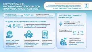 В рамках содействия добровольному переселению из трудоизбыточных в трудодефицитные регионы страны внедрены новые меры государственной поддержки. Ключевым инструментом этой политики стал «Сертификат экономической мобильности», представляющий собой финансовую помощь в размере порядка 4,5 млн тенге для приобретения жилья. За последние три года данной мерой поддержки воспользовались более половины из 6 тыс. семей, переселившихся в трудодефицитные регионы.