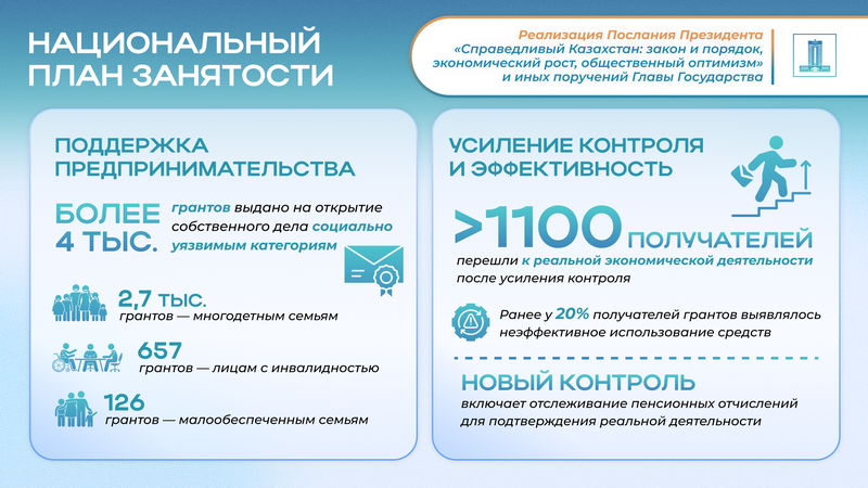 Основное внимание Правительства сфокусировано на практической реализации основных принципов Послания. В рамках обеспечения социальной справедливости осуществляется переход к проактивной и адресной модели государственной поддержки, формируется инклюзивная среда с равными возможностями для всех граждан. В целях содействия экономическому росту реализуется комплекс мер по стимулированию продуктивной занятости, поддержке предпринимательских инициатив и созданию качественных рабочих мест. Обеспечение принципа «Закон и порядок» находит отражение в усилении защиты трудовых прав граждан, обеспечении безопасных условий труда и развитии конструктивного социального партнерства.