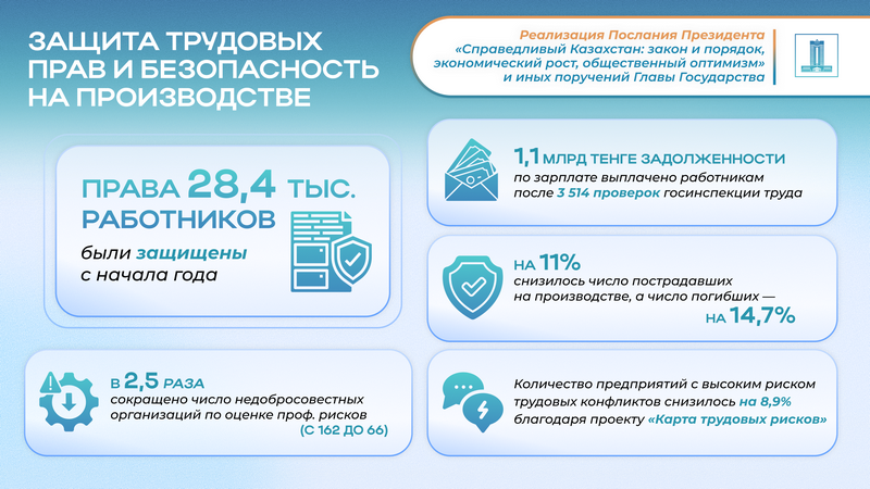 Защита трудовых прав граждан обеспечивается через постоянный государственный контроль. За отчетный период Государственной инспекцией труда проведено 3 514 проверок, в ходе которых выявлено 4 132 нарушения и выдано 2 287 предписаний для их устранения. В результате наложены штрафы на сумму более 277 млн тенге, обеспечена выплата 1,1 млрд тенге задолженности по заработной плате перед 3,4 тыс. работниками. Всего за этот период были защищены права 28,4 тыс. работников.