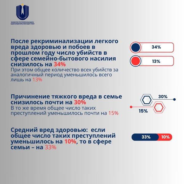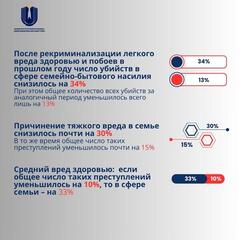 легкого вреда здоровью и побоев в прошлом году число убийств в сфере семейно-бытового насилия снизилось на 34%. При этом общее количество всех убийств за аналогичный период уменьшилось всего лишь на 13%.