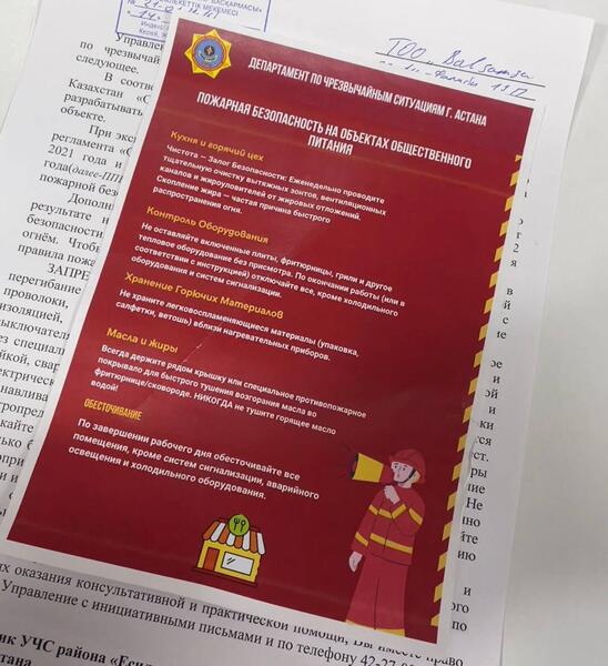 Сотрудники столичного акимата и Департамента по чрезвычайным ситуациям провели разъяснительную беседу с представителями объектов общественного питания, расположенных в районе Есиль. Специалисты напомнили предпринимателям о правилах пожарной безопасности, передает официальный сайт акимата Астаны.