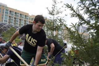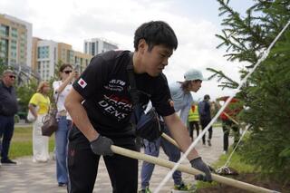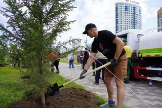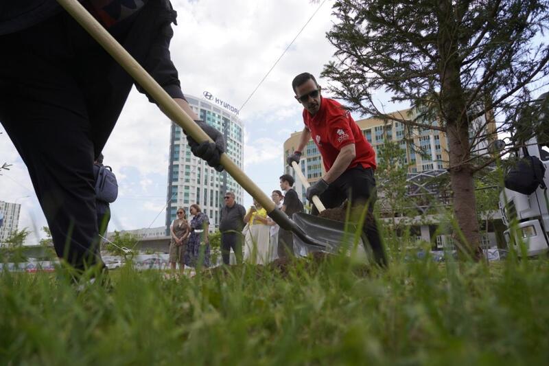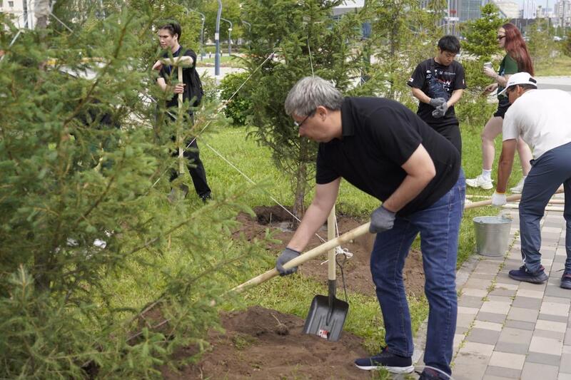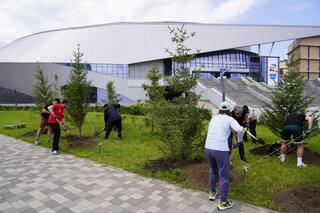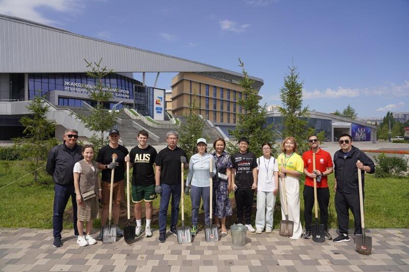 Участники чемпионата из 11 стран мира высадили деревья на территории столичного Дворца единоборств имени Жаксылыка Ушкемпирова.